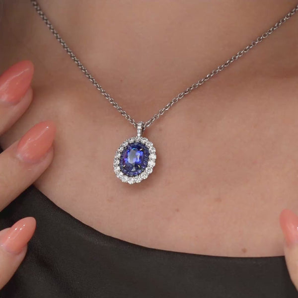 Custom hand fabricated necklace featuring a 2.87 carat oval sapphire center stone with .29 carats total weight in accent sapphires and 1.04 carats total in round brilliant cut accent diamonds set in platinum with an adjustable 16-18" platinum cable chain.