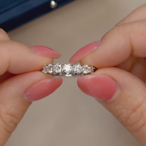 This elegant eternity band features a continuous row of sparkling sapphires and diamonds, crated in 18K white gold. The perfect choice for expressing everlasting love, this beautiful piece is sure to bring joy for years to come.
