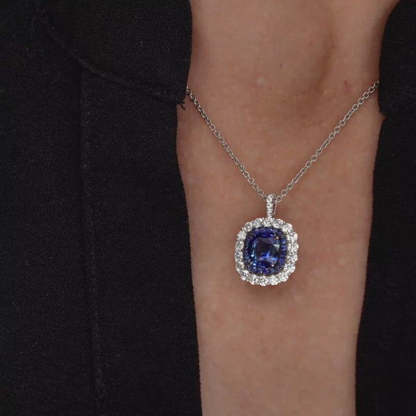This stunning necklace is crafted from platinum and features a sapphire pendant adorned with diamond accents. Its sophisticated design and timeless elegance is perfect for any occasion.
